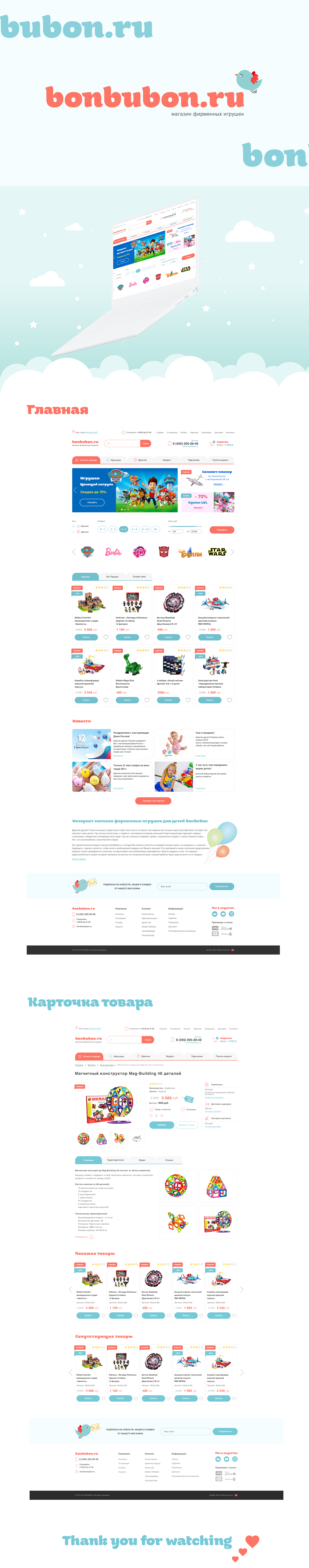 Разработать дизайн главной страницы и карточки товара. Целевая аудитория сайта молодые родители (в основном с мобильных устройств) и более зрелая аудитория 50+ (десктопная версия) присматривают подарки внукам.